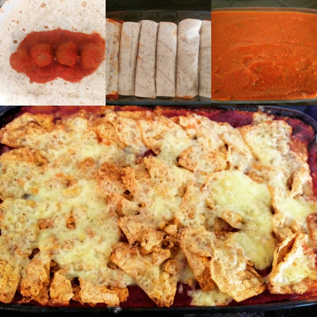 brown the meatballs in a frying pan with a little olive oil. When browned add the tomato based pasta sauce of your choice,once the sauce is warm add 4 meatballs to each wrap and wrap them into a roll shape.