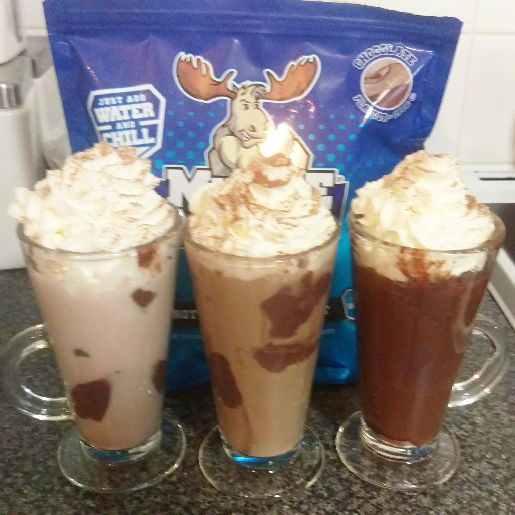 Are you struggling with being surrounded by all the indulgences and extra calorie drinks leading up to winter, then think smart. Don’t waste your calories try to improvise, add a serving of muscle moose moose to your festive drinks. Above you can see 2 coffees of different strengths with added protein chocolate moose and light squirty cream topped with cinnamon consisting of 197cals and the 3rd (my favourite) is a hot chocolate with added protein chocolate moose blended together then light squirty cream added as a topping along with cinnamon this is 316cals…by adding the protein moose it helps satisfy your hunger,indulges your sweet craving and gives you over 15g of protein in each drink(including protein from the milk and Squirty cream)…these taste amazing especially after a cold winter walk enjoy.